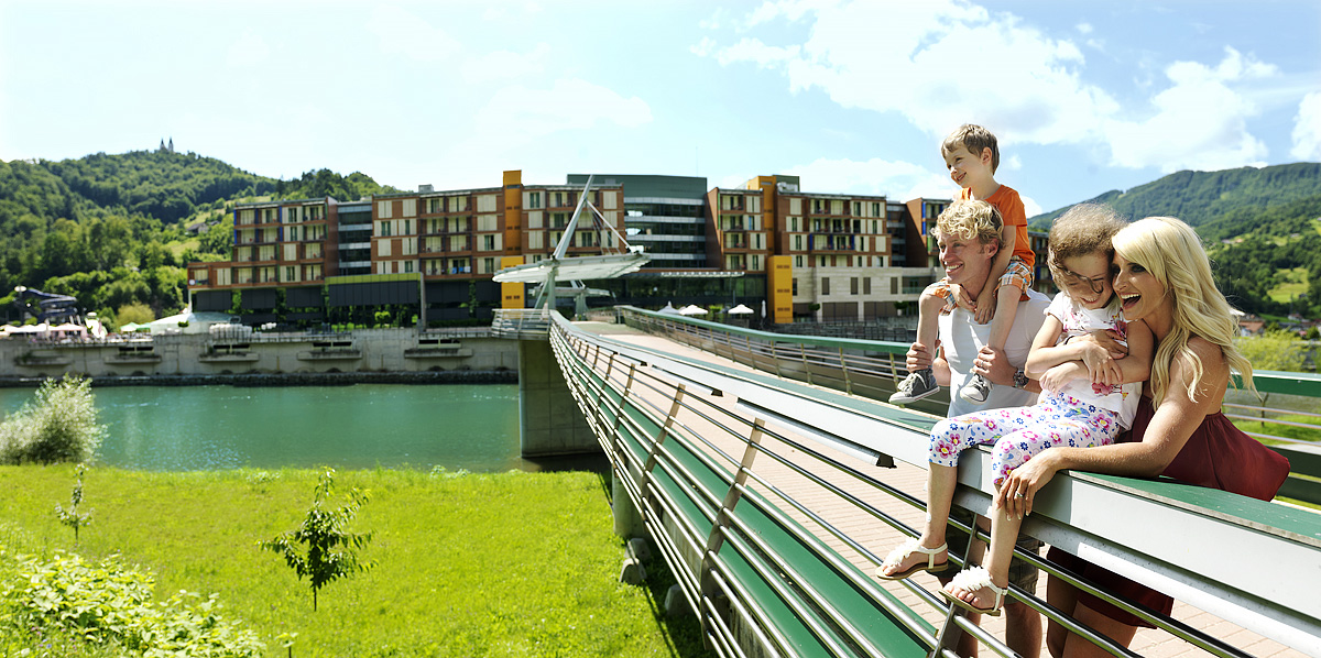 termalny basen zewnętrzny, kąpielisko (26 - 27°), brodzik, zjeżdżalnia