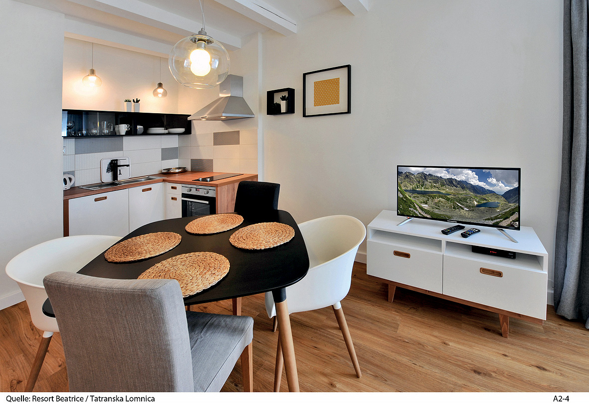 36 m² - pokój dzienny z rozkładaną kanapą dla 2 osób, sypialnia z łóżkiem małżeńskim i 1 łóżkiem pojedynczym, kuchnia, jadalnia, łazienka z prysznicem, niektóre apartamenty z balkonem