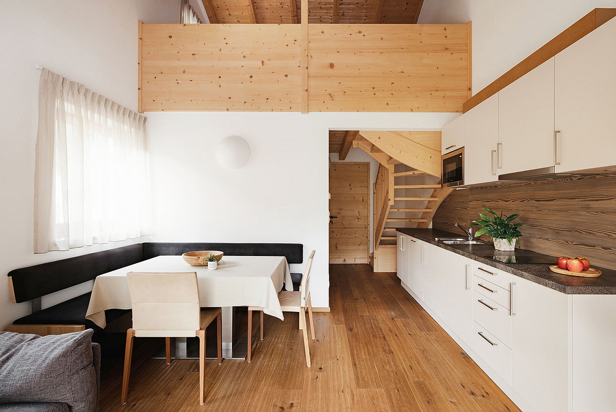 55 m² - 1. piętro apartamentu:1 sypialnia z łóżkiem małżeńskim i 1 łóżkiem pojedynczym, pokój dzienny z aneksem kuchennym i rozkładaną kanapą dla 1 osoby, łazienka, 2x balkon; 2. piętro apartament (na poddaszu): częściowo zamknięta sypialnia z łóżkiem małżeńskim