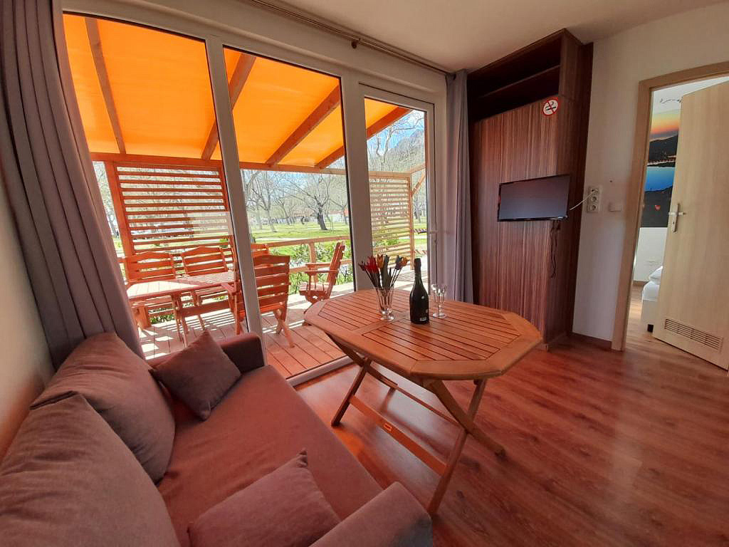 24 m² – sypialnia z łóżkiem małżeńskim, pokój z dwoma osobnymi łóżkami, salon z aneksem kuchennym (płyta grzewcza, lodówka, naczynia, ekspres do kawy) i sofą dla 2 dzieci do nieukończonych 12 lat, łazienka z prysznicem, zadaszony taras