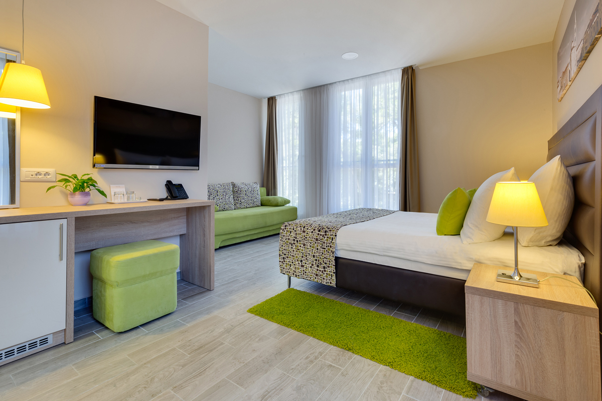 22 m², pokój z łóżkiem małżeńskim lub dwoma osobnymi łóżkami z możliwością dostawki w postaci rozkładanej kanapy dla dziecka do nieukończonych 16 lat, łazienka z prysznicem, balkon