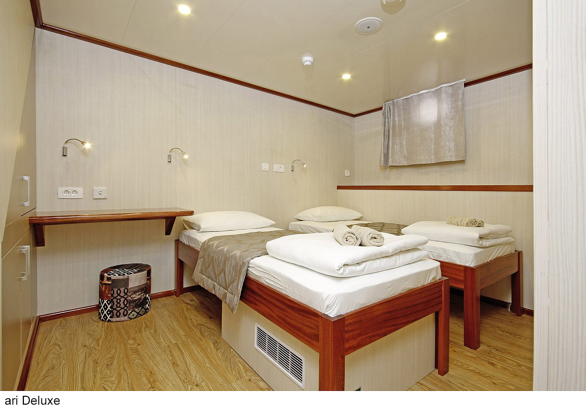 Deluxe 2/3 - kabina z dwoma oddzielnymi łóżkami lub łóżkiem małżeńskim i dodatkowym łóżkiem, prywatna łazienka z prysznicem i toaletą