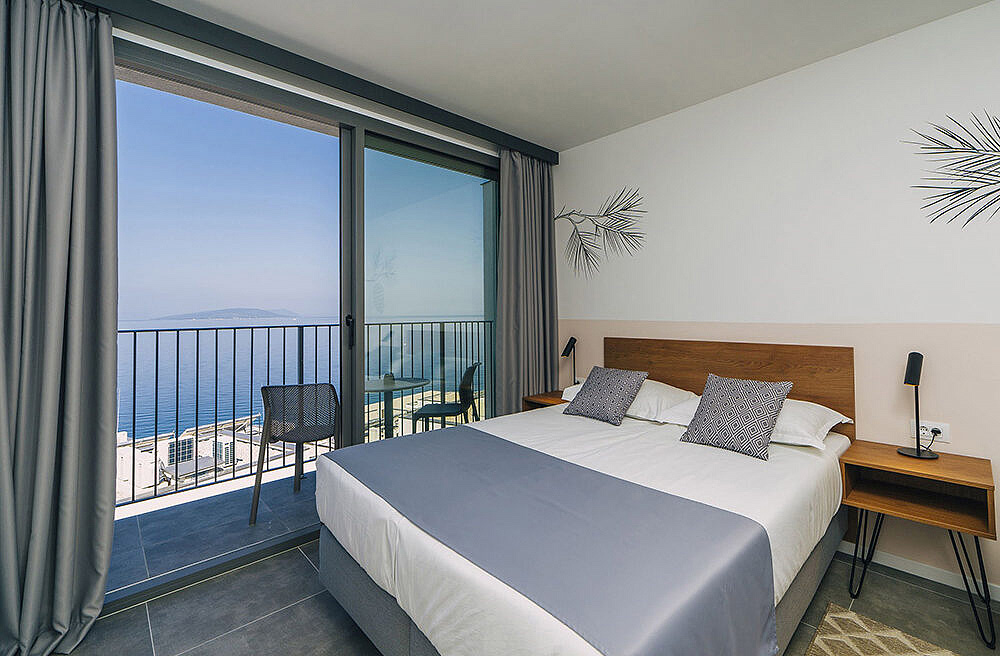 pokój z łóżkiem małżeńskim lub 2 łóżkami oddzielnymi, łazienka z prysznicem, balkon orientowany od strony morza