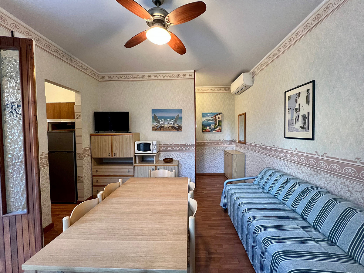 55 m² - 1 sypialnia z łóżkiem małżeńskim, 1 sypialnia z 2 łóżkami pojedynczymi, salon z aneksem kuchennym i rozkładaną sofą dla 1 osoby, łazienka z prysznicem, duży taras