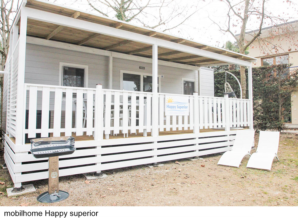 mobilhome Happy easy – klimatyzacja*, mały grill elektryczny; mobilhome Happy plus – klimatyzacja*, mały grill elektryczny, ekspres do kawy i kuchenka mikrofalowa; mobilhome Happy superior – klimatyzacja*, mały grill elektryczny, ekspres do kawy, kuchenka mikrofalowa, suszarka do włosów.