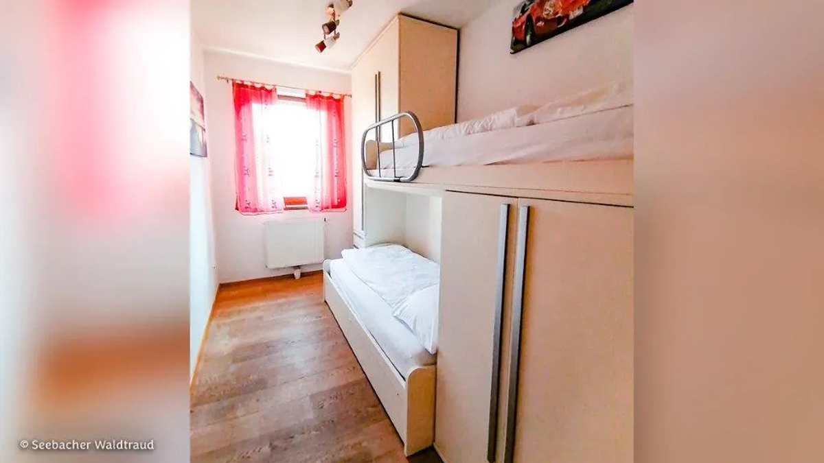 trilo 6 - 58 m² - 1 sypialnia z łóżkiem małżeńskim, sypialnia z łóżkiem piętrowym, salon z aneksem kuchennym i rozkładaną sofą dla 2 osób, korytarz, łazienka, osobna toaleta i bidet, balkon