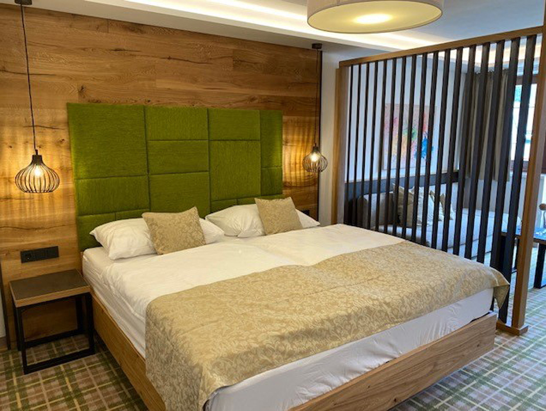 Deluxe 5 typ B - 40 m² - pokój z łóżkiem małżeńskim i ewentualnie 2 rozkładanymi sofami dla maksymalnie 3 osób lub 1 rozkładaną sofą dla 2 osób i dostawką, łazienka z wanną lub prysznicem, balkon; pokoje znajdują się zawsze w nowej części hotelu, wybudowanej w 2016 roku i wyposażone są w nowocześniejsze meble