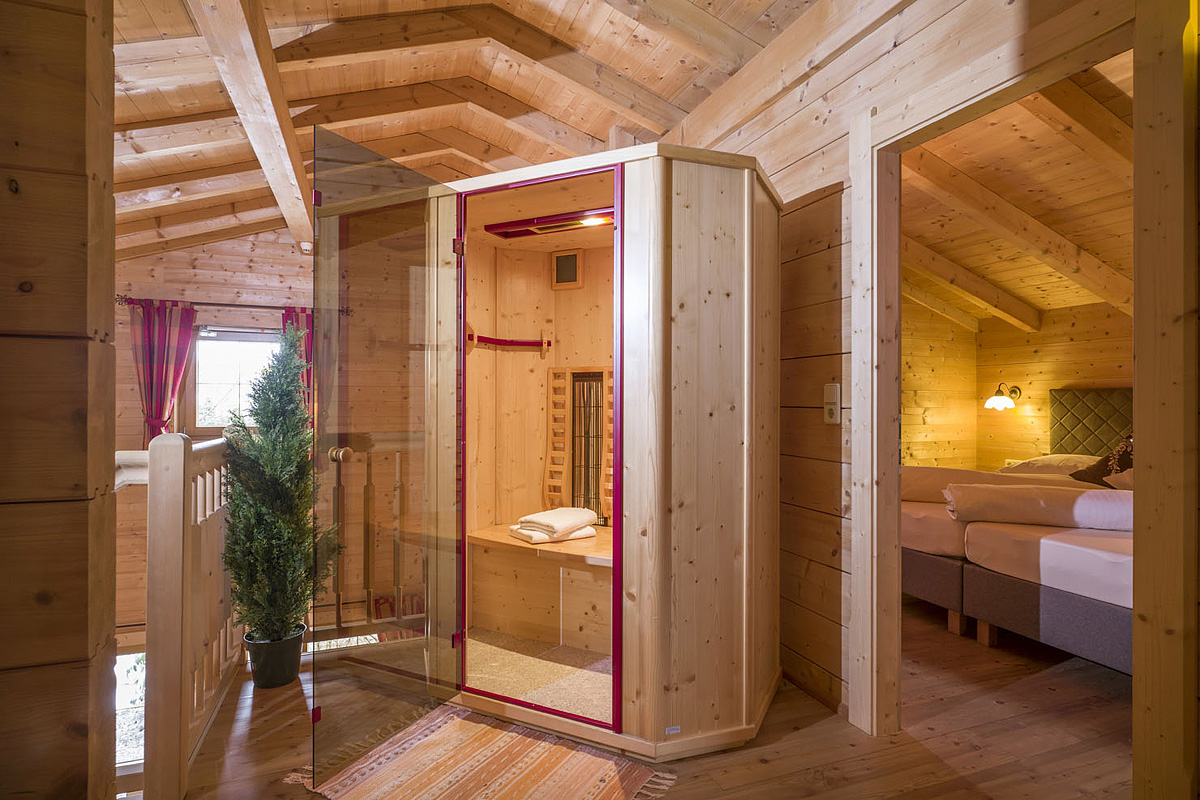 120 m² - 1 piętro domku: mała sypialnia z 1 łóżkiem pojedynczym, salon z aneksem kuchennym, sofą i kominkiem, osobna toaleta, taras; 2 piętro domku: 3 sypialnie z łóżkami podwójnymi, 1 sypialnia z 3 łóżkami pojedynczymi, 2 łazienki, 1 prywatna kabina na podczerwień, zazwyczaj balkon