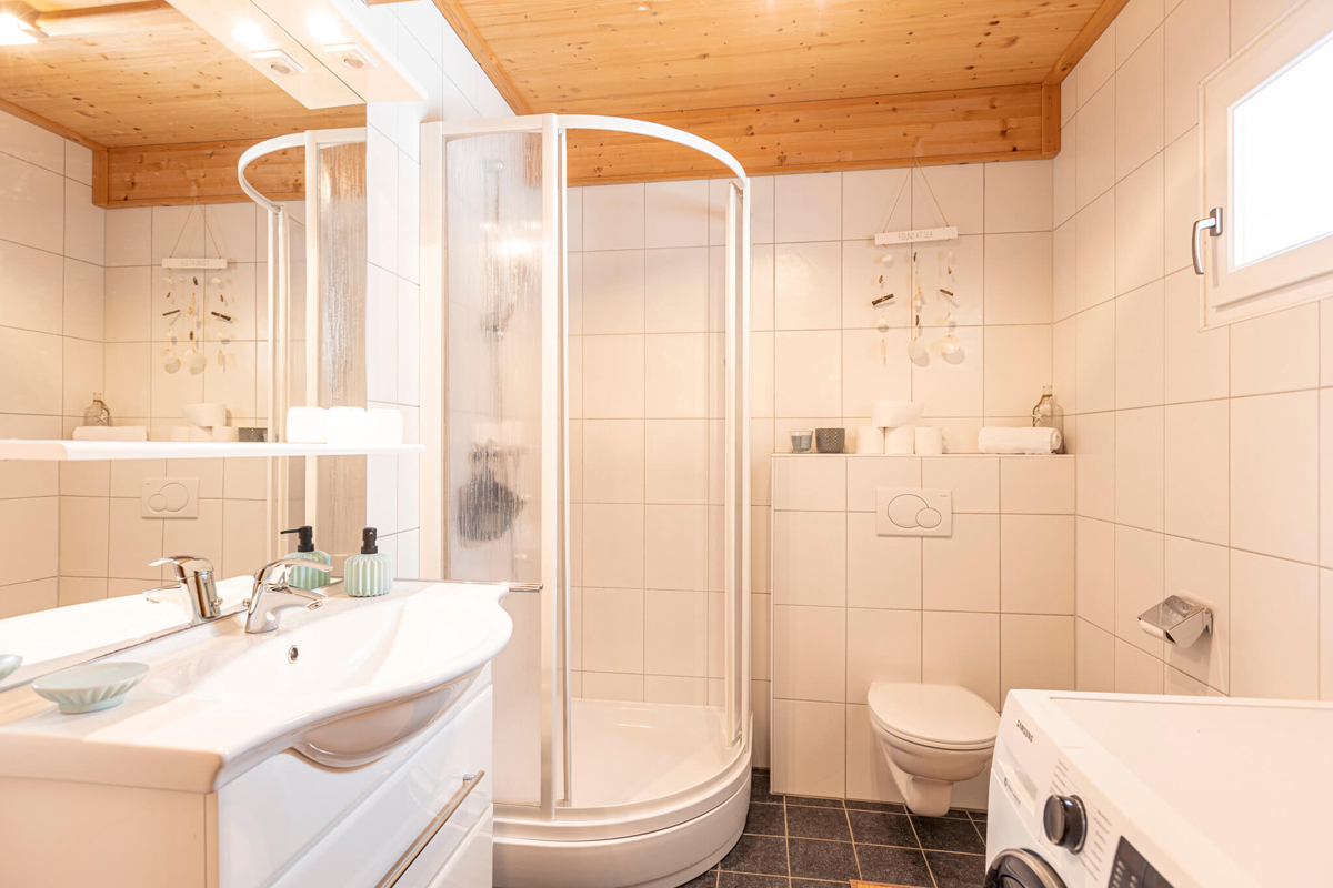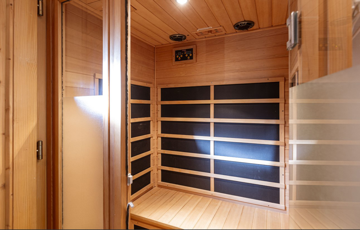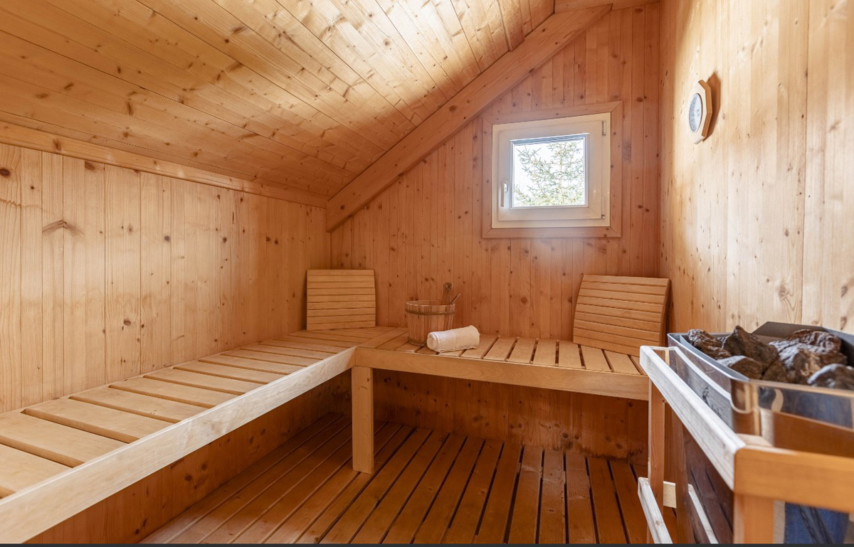 100 m² - 1 piętro domku: salon z aneksem kuchennym, osobna toaleta, taras; 2 piętro domku: 1 sypialnia z łóżkiem małżeńskim, 1 sypialnia z łóżkiem małżeńskim i łóżkiem piętrowym oraz druga sypialnia z 2 łóżkami pojedynczymi, 2 łazienki (1 z prysznicem i 1 z wanną), prywatna sauna, balkon
