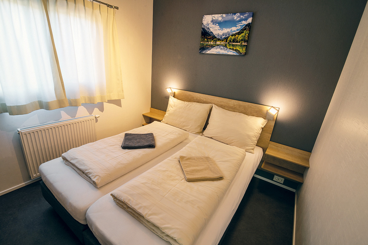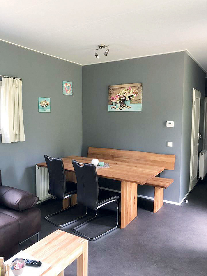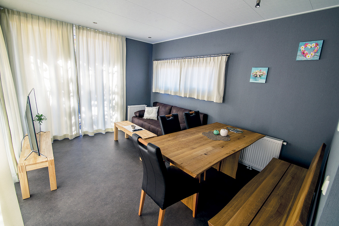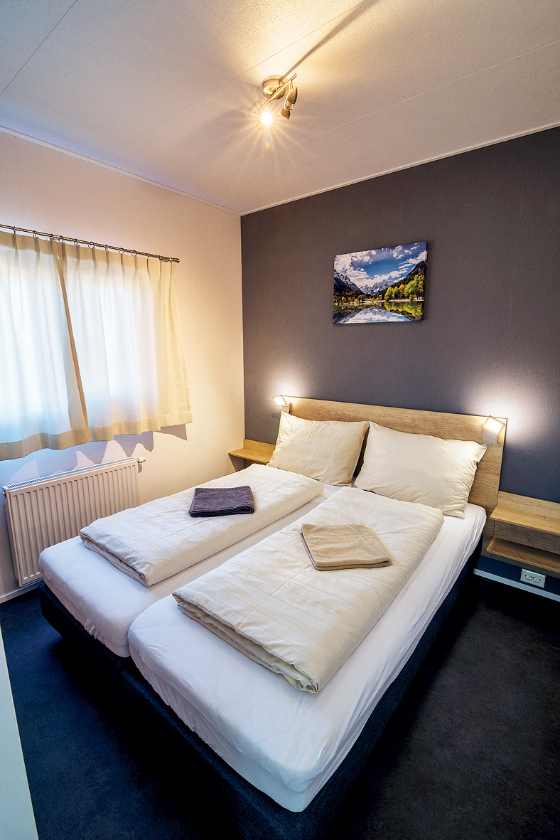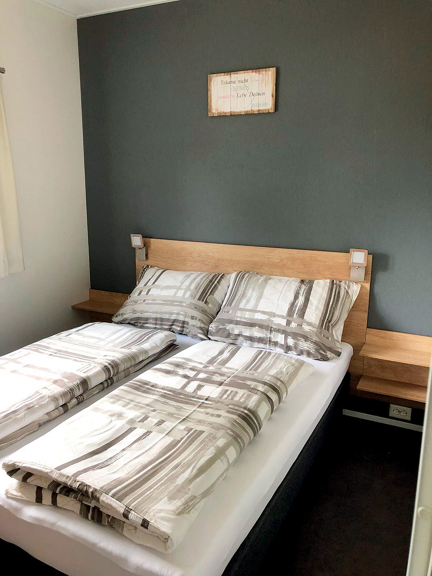 Chalet 4+2 - 45 m² - 1 sypialnia z łóżkiem małżeńskim, sypialnia z 2 łóżkami pojedynczymi, pokój dzienny z aneksem kuchennym i rozkładaną kanapą dla 2 dzieci poniżej 11 lat, łazienka, taras