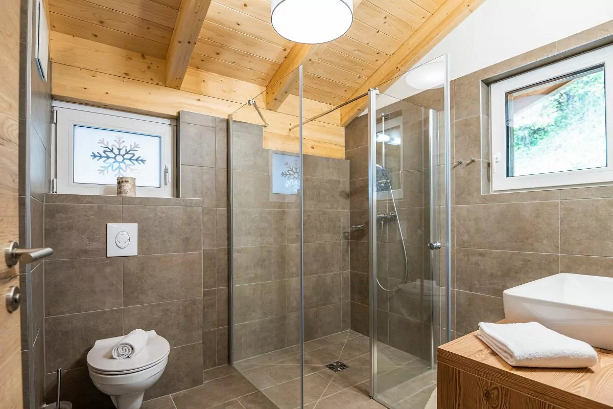 125 m² - I piętro chaletu: pokój dzienny z aneksem kuchennym i kanapą, pomieszczenie na narty i buty narciarskie, oddzielne WC, taras; II piętro chaletu: 4 sypialnie z podwójnymi łóżkami, 3 łazienki (2 z prysznicem i 1 z prysznicem oraz prywatną sauną na podczerwień), 2 balkony