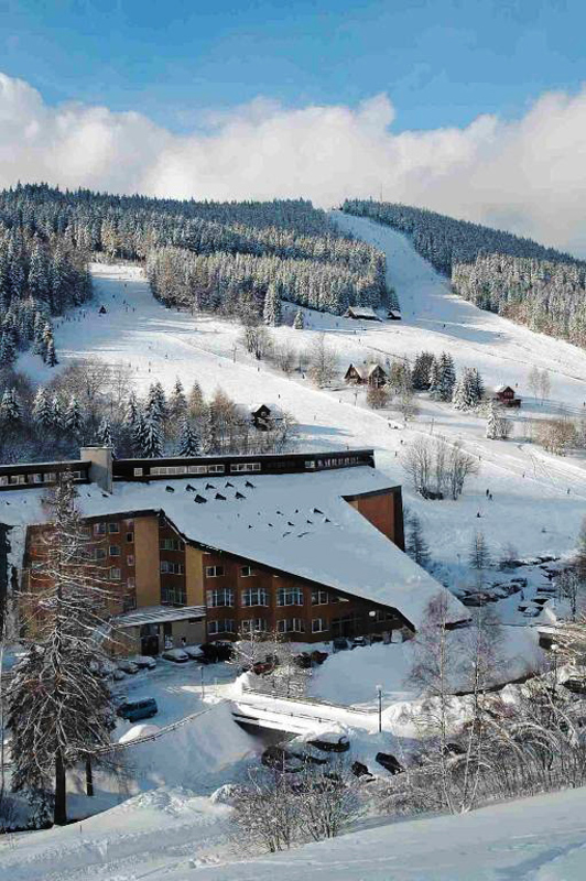 Lokalizacja hotelu w spokojniejszej części Harrachova (Rýžoviště) u podnóża Czarciej Góry