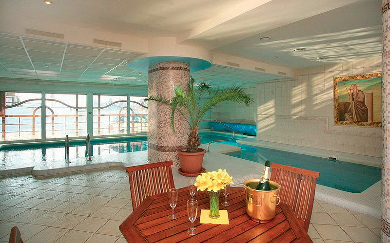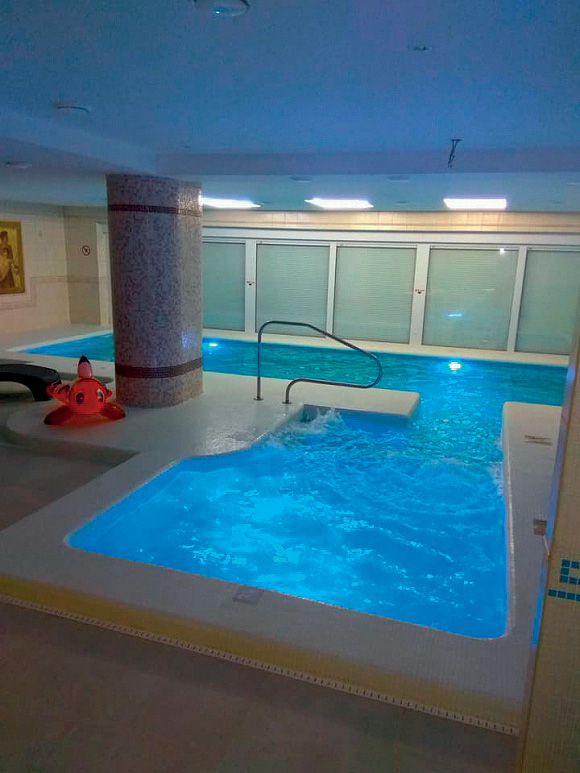basen 36 m² z leżakami, jacuzzi dla maksymalnie 8 osób, sauna fińska*, aromatyczna para*, solarium poziome*, kącik relaksacyjny z leżakami, masaże*, bilard*