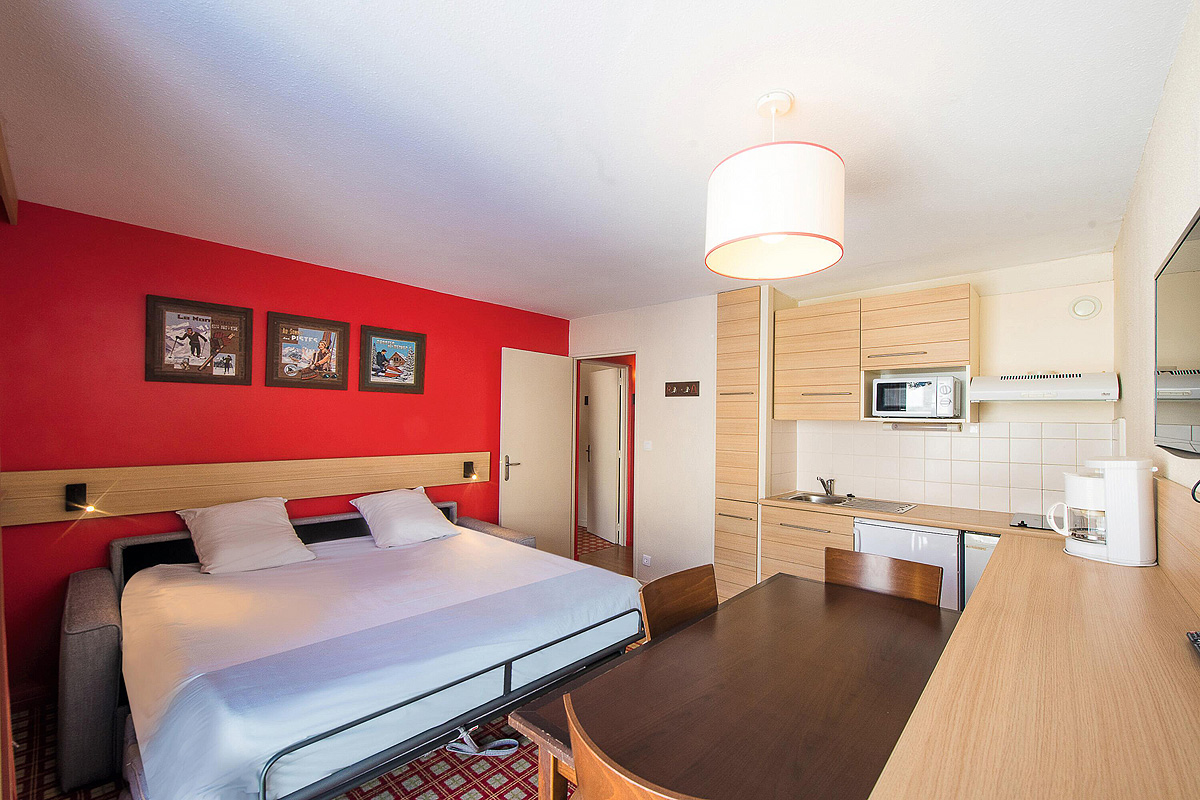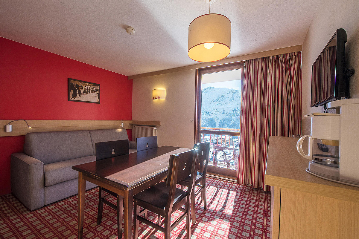 30 m² 1 sypialnia z łóżkiem piętrowym, salon z aneksem kuchennym i rozkładaną sofą dla 2 osób (możliwość spania również w wersji „szufladkowej”), łazienka, balkon z widokiem na góry