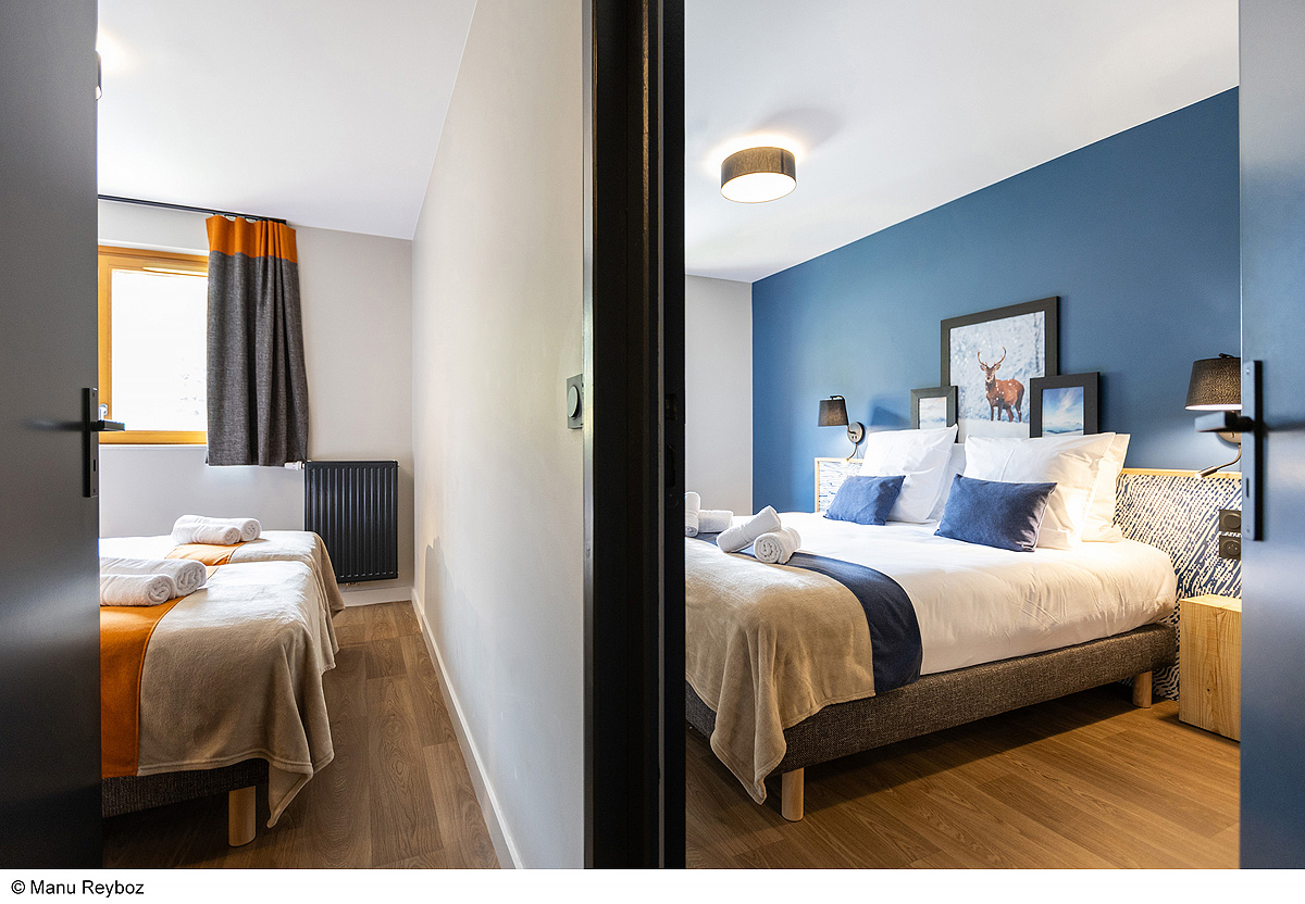 bilo 4 typ B - 31 - 34 m² - 1 sypialnia z 2 pojedynczymi łóżkami (można je połączyć w łóżko podwójne), pokój dzienny z aneksem kuchennym i rozkładaną kanapą dla 2 osób (możliwy typ "szuflada"), łazienka, balkon z widokiem na góry