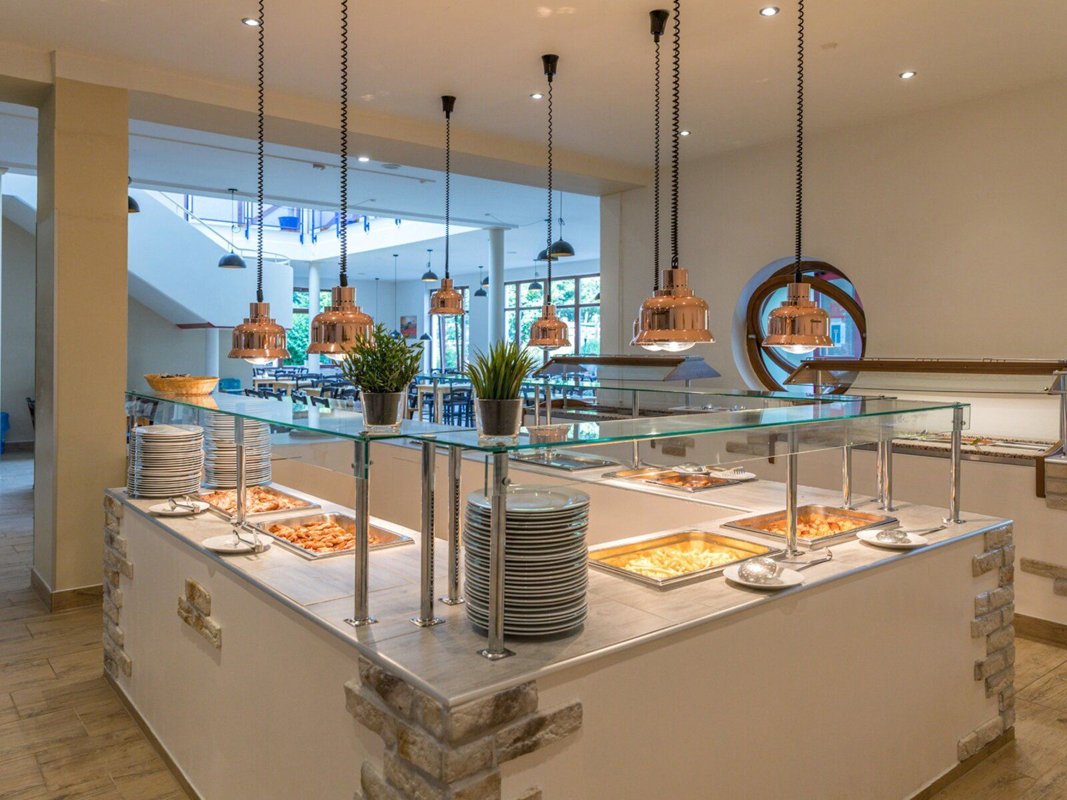 bufet zimnych i ciepłych przystawek, dań głównych z dodatkami, sałatek i deserów, osobny bufet dla dzieci; w godz. 12:00-21:00 wybrane napoje bezalkoholowe, w godz. 16:00-21:00 piwo i wino stołowe, inne napoje za opłatą