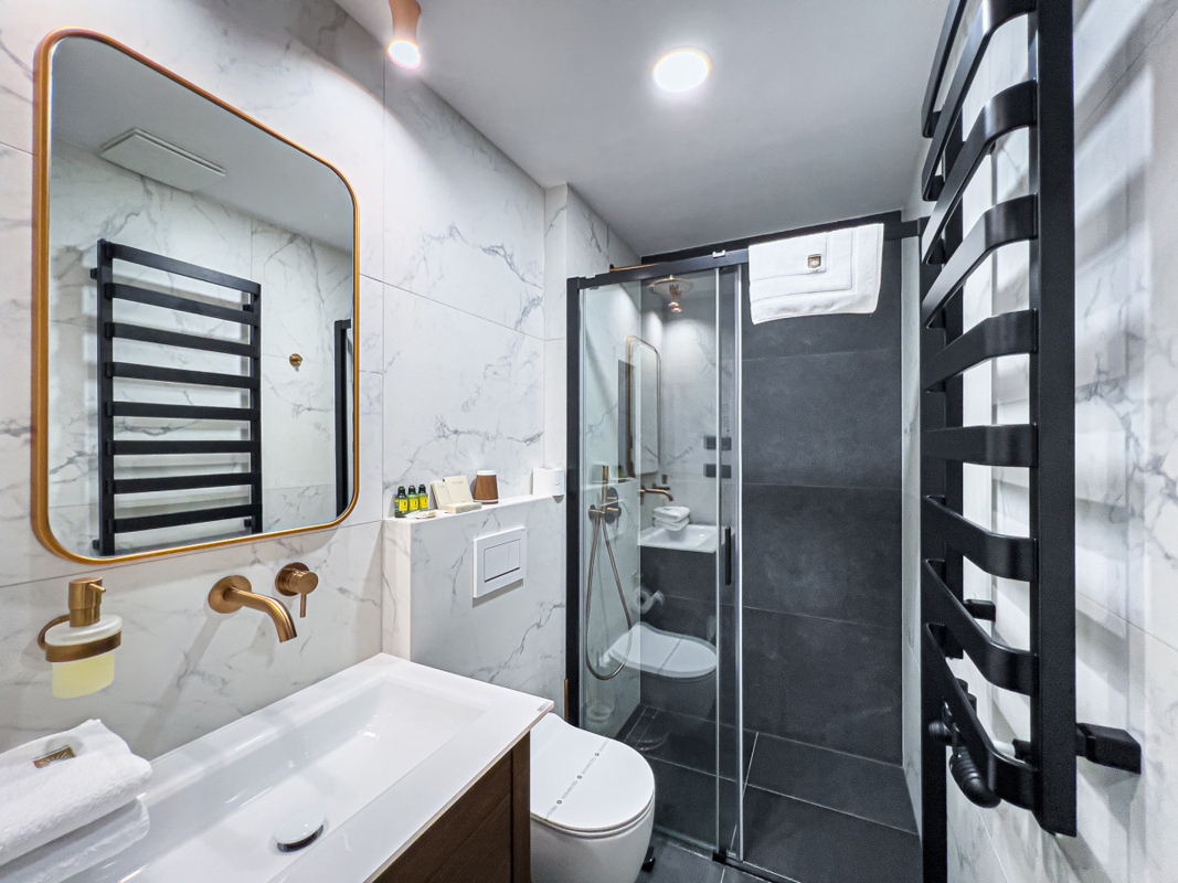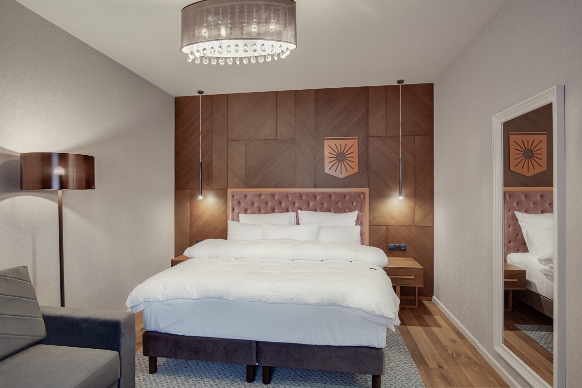 25-28 m² – pokój z łóżkiem małżeńskim lub 2 pojedynczymi łóżkami, rozkładaną sofą jako dostawką dla 2 osób, łazienką z prysznicem lub wanną, część pokoi z balkonem