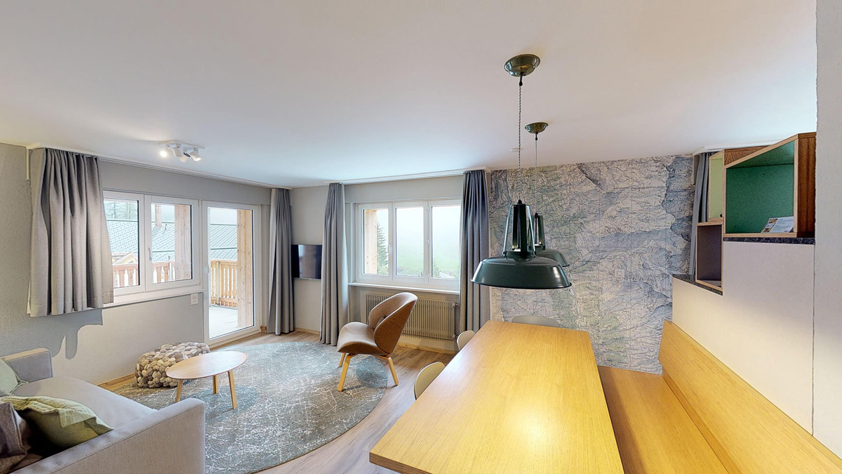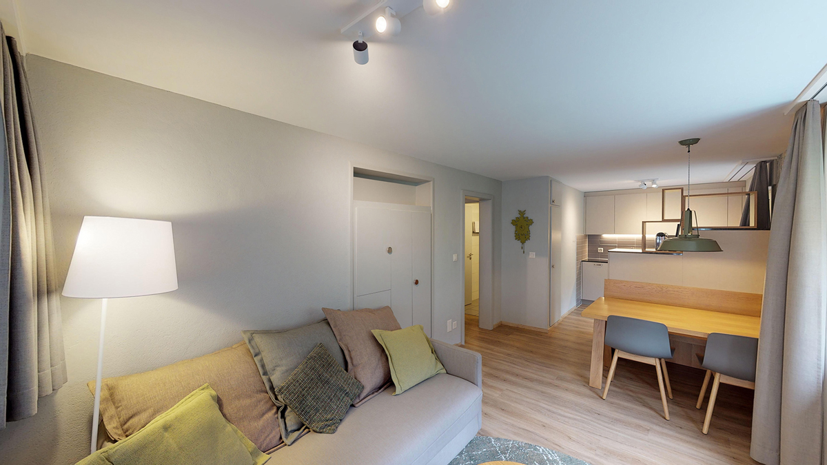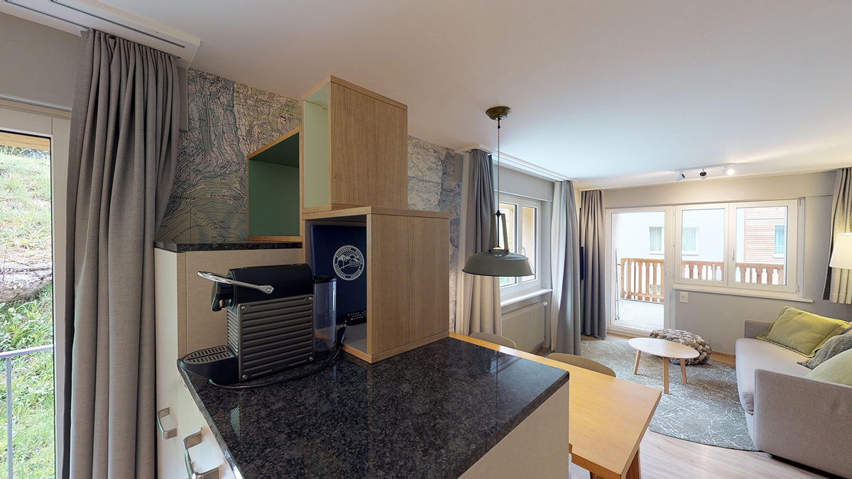 53 m² - sypialnia z 2 pojedynczymi łóżkami, kolejne 1 pojedyncze łóżko przy wejściu do apartamentu, salon z aneksem kuchennym i rozkładaną sofą dla 2 osób, łazienka, balkon; apartament zazwyczaj znajduje się na poddaszu ze skośnym dolnym sufitem
