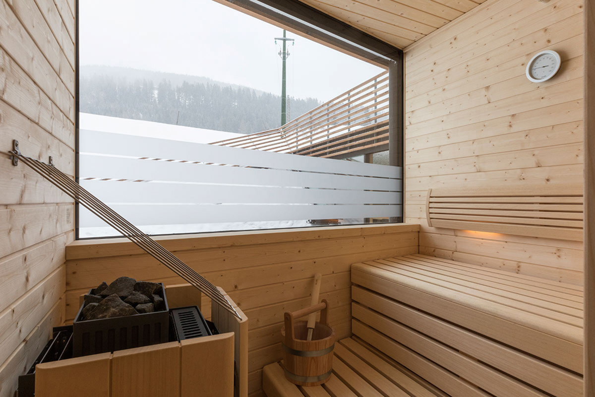 bilo 2+3 Panorama Suite Wellness - 81 m² - 1 sypialnia z 1 łóżkiem pojedynczym o długości 170 cm i łóżkiem piętrowym, salon z aneksem kuchennym i częściowo oddzielnym łóżkiem podwójnym, sauna fińska, 2 łazienki, balkon; w apartamencie mogą nocować maksymalnie 2 osoby dorosłe i 3 dzieci poniżej 18 lat