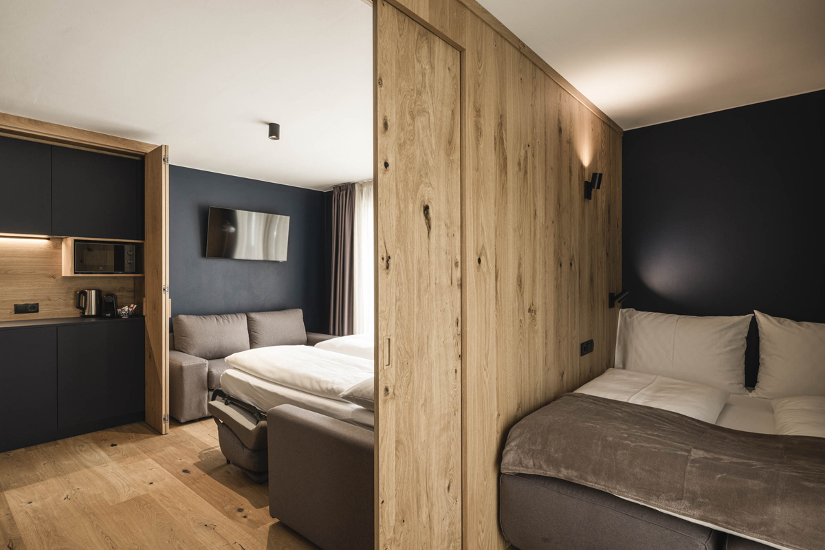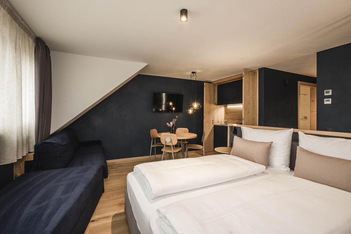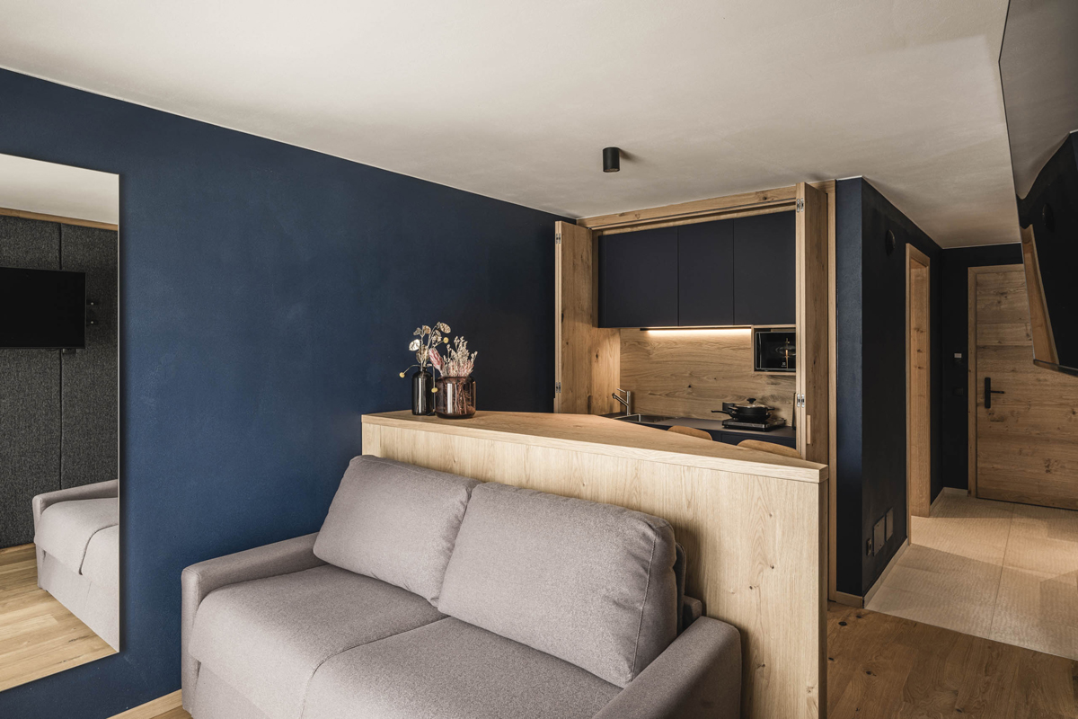 mono 2+1 - 34-38 m² – salon z aneksem kuchennym, łóżkiem małżeńskim i rozkładaną sofą dla 1 osoby, łazienka; w apartamencie mogą nocować maksymalnie 2 osoby dorosłe i 1 dziecko do lat 14