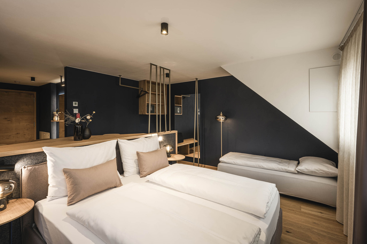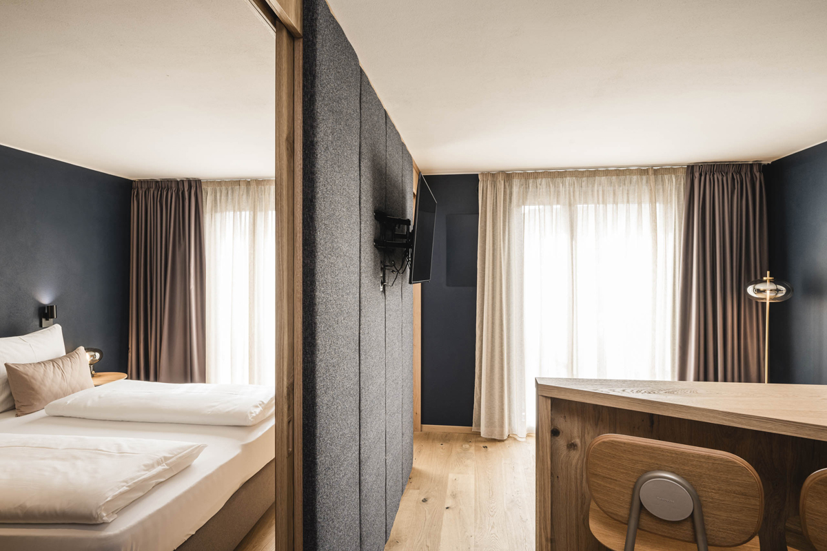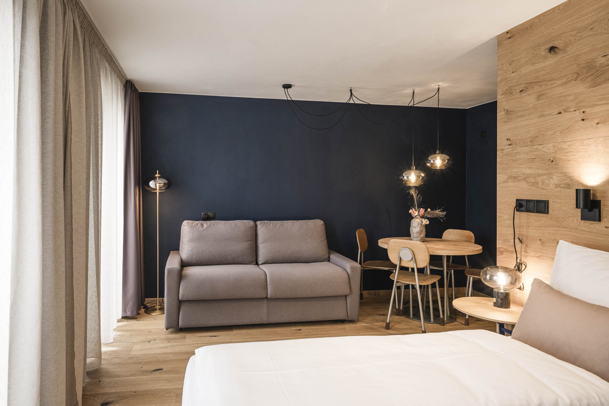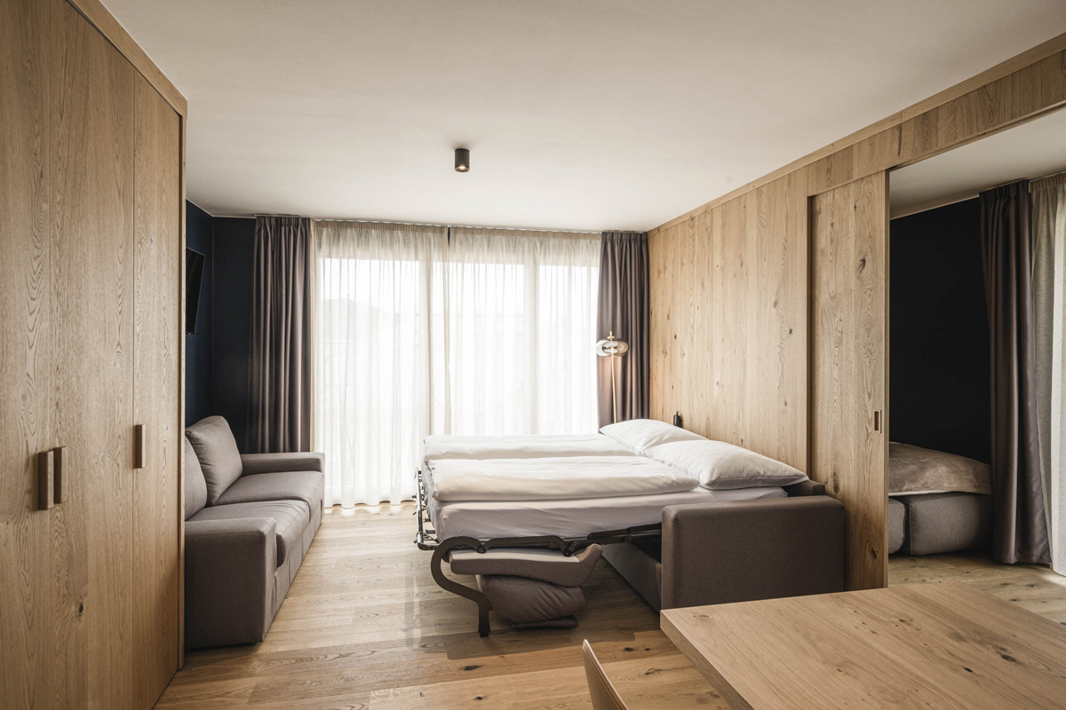 mono 2+1 - 34-38 m² – salon z aneksem kuchennym, łóżkiem małżeńskim i rozkładaną sofą dla 1 osoby, łazienka; w apartamencie mogą nocować maksymalnie 2 osoby dorosłe i 1 dziecko do lat 14