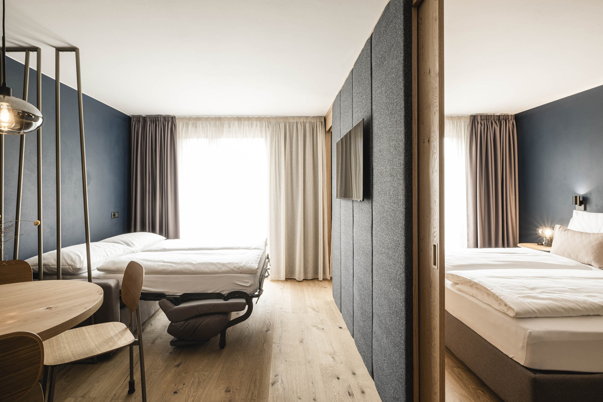 trilo 4 - 50 m² – 1 sypialnia z łóżkiem małżeńskim, 1 sypialnia z drzwiami przesuwnymi i rozkładaną sofą dla 2 osób, salon z aneksem kuchennym, łazienka, balkon