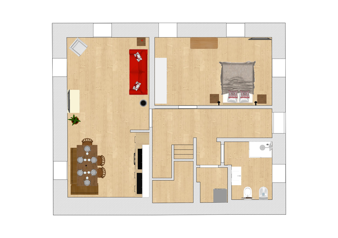 bilo 4 - 60 m² - 1 sypialnia z łóżkiem małżeńskim, salon z aneksem kuchennym i rozkładaną sofą dla 2 osób, łazienka; apartament znajduje się na parterze