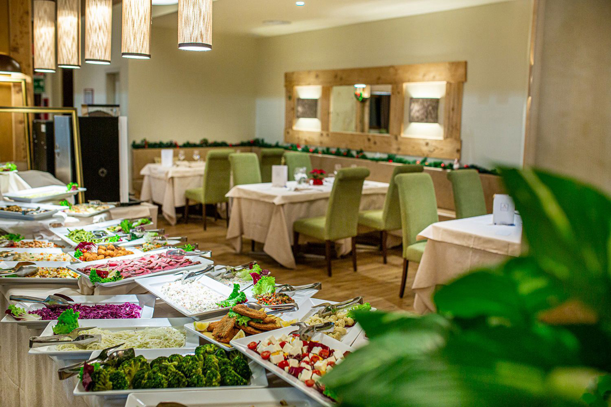 menu serwowane z wyborem 3 gorących przystawek i 3 dań głównych z dodatkiem, bufetem sałatkowym, serwowanym deserem, wodą (0,5 l) i winem stołowym (0,25 l), inne napoje za opłatą