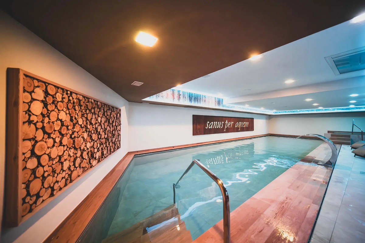 basen 14 x 5 m, jacuzzi dla 6 osób, sauna fińska#, biosauna#, aromatyczna sauna parowa#, basen z zimną wodą#, wielofunkcyjny prysznic#, lampa do opolania twarzy i dekoltu*, kącik relaksacyjny z leżakami i herbatkami ziołowymi, masaże#*, usługi kosmetyczne*, siłownia#, piłkarzyki; z usług oznaczonych # mogą korzystać dzieci do 14 lat