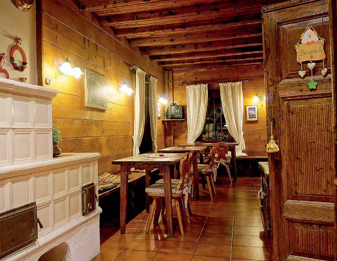 recepcja / hol, restauracja, typowy górski pokój wspólny z piecem kaflowym opalanym drewnem, bar, pokój wspólny z telewizorem i kącikiem dla dzieci, łącze internetowe Wi-Fi, przechowalnia sprzętu narciarskiego i butów narciarskich, winda, zarezerwowane miejsca parkingowe