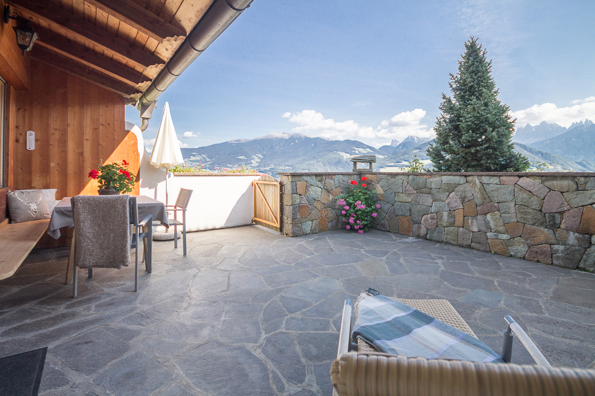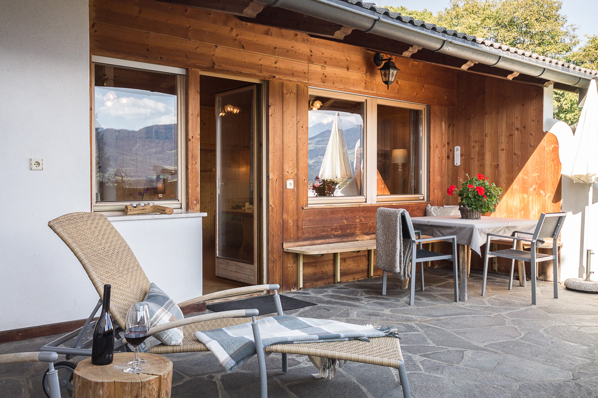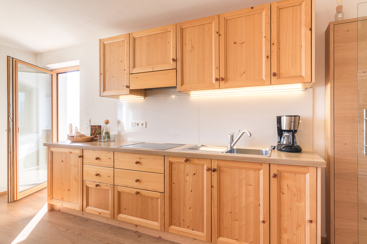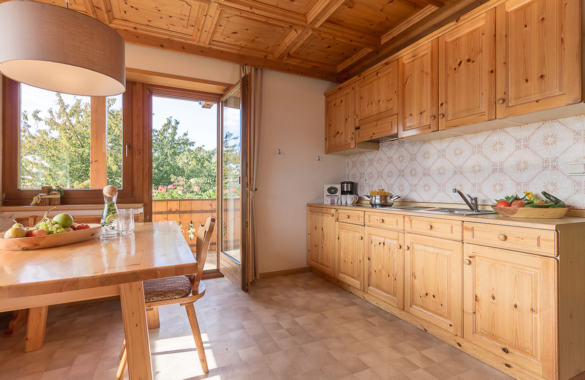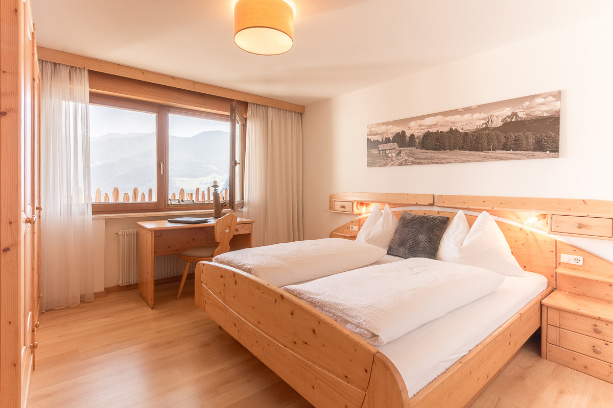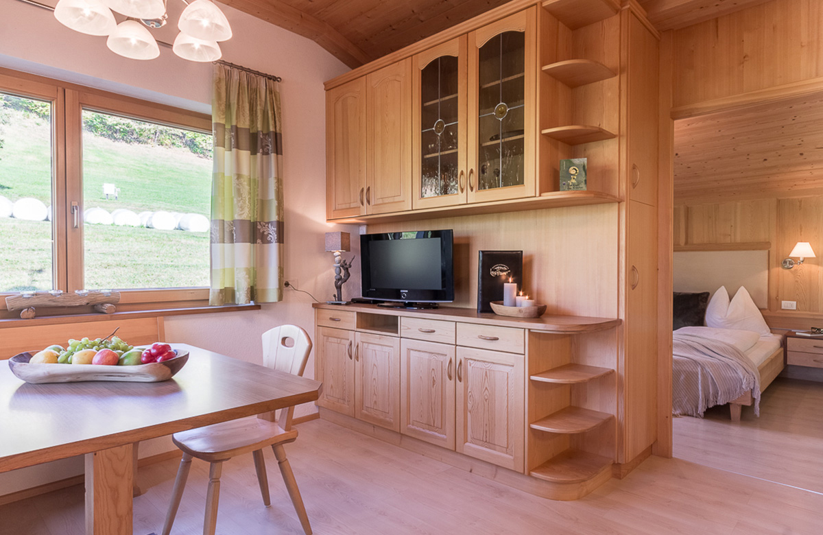 bilo 3 Dolomitenblick - 42 m² – 1 sypialnia z łóżkiem małżeńskim, pokój dzienny z aneksem kuchennym z rozkładana kanapą dla 1 osoby, łazienka, balkon (20 m²)